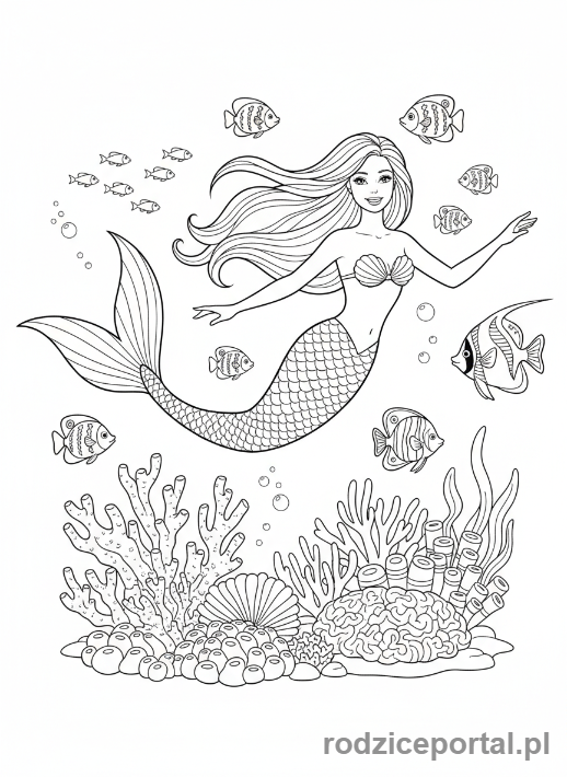 ⬇️ PobierzKolorowanka Barbie – Barbie jako syrenka pływająca pod wodą.