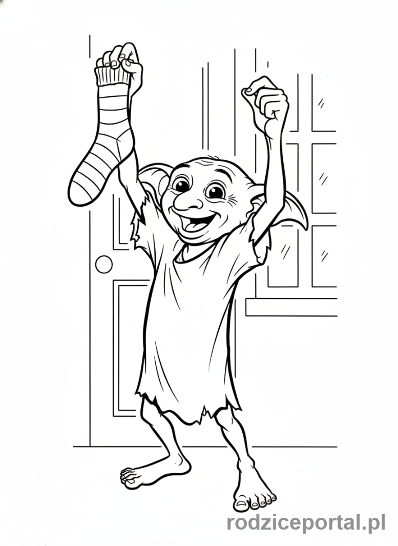 ⬇️ PobierzKolorowanka Harry Potter – Zgredek trzymający skarpetkę