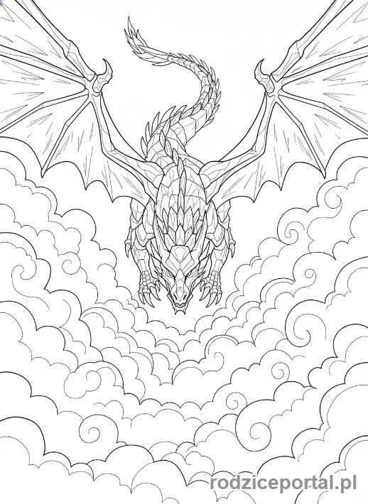 Kolorowanka Lego Ninjago – Lodowy Smok Zane’a, majestatyczny i potężny, szybujący w chmurach, widok z góry