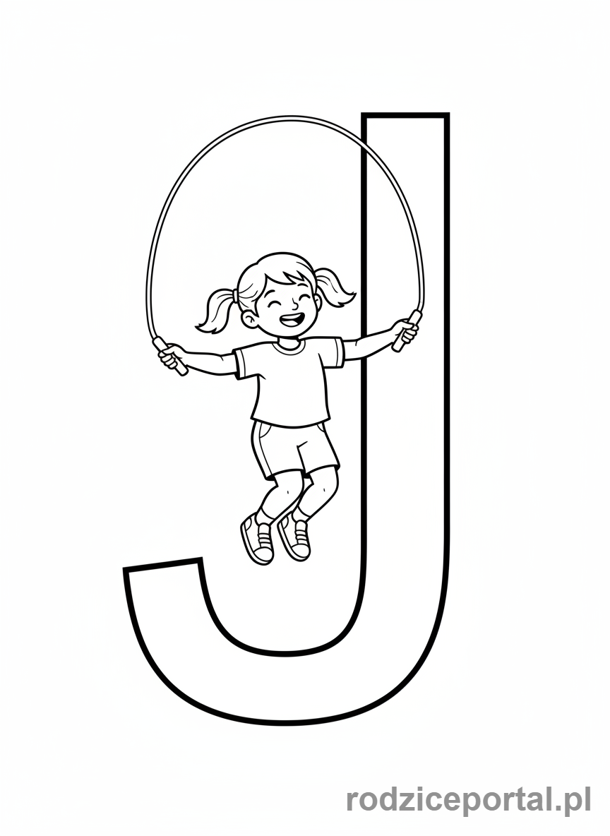 ⬇️ PobierzKolorowanka Litery Drukowane – Litera J, dziewczynka skacze