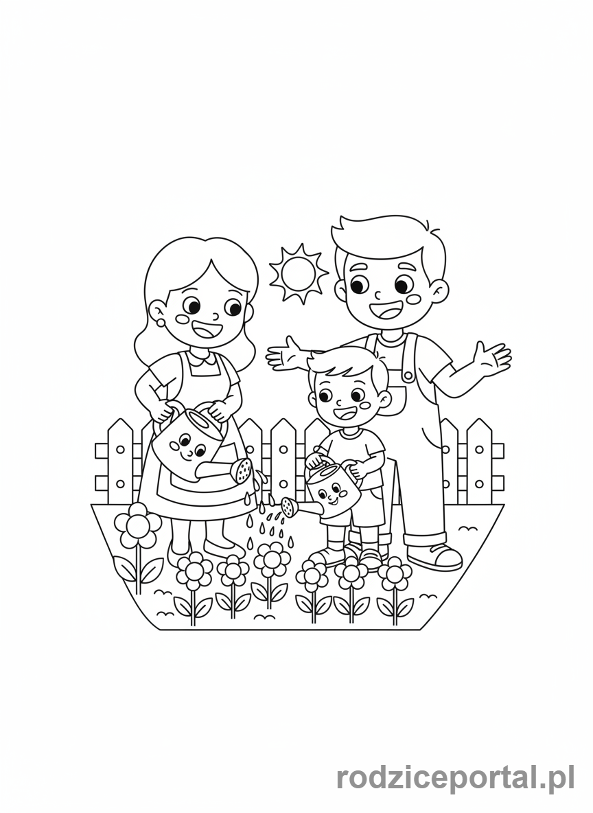 Kolorowanka Oszczędzanie Wody – Rodzina podlewa ogród konewką