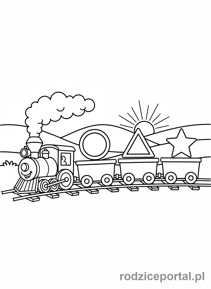 ⬇️ PobierzKolorowanka Pociągi – Pociąg z wagonami przewożącymi różne kształty dla dzieci.