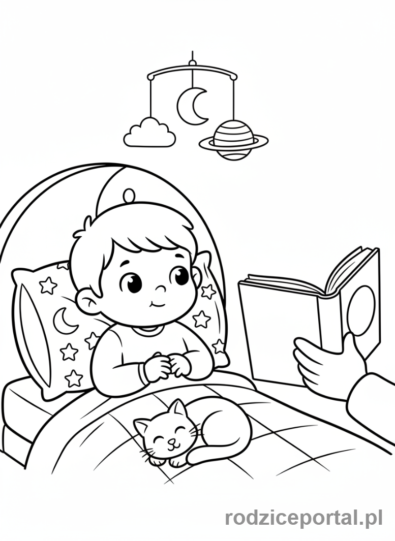 Kolorowanka Pory Dnia Zadania – Dziecko slucha bajki na dobranoc