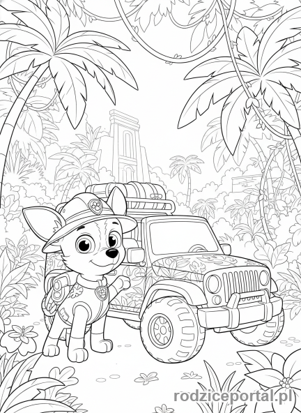 Pobierz darmowe kolorowanki Kolorowanka Psi Patrol Tracker W Dżungli. Idealne dla dzieci do druku.