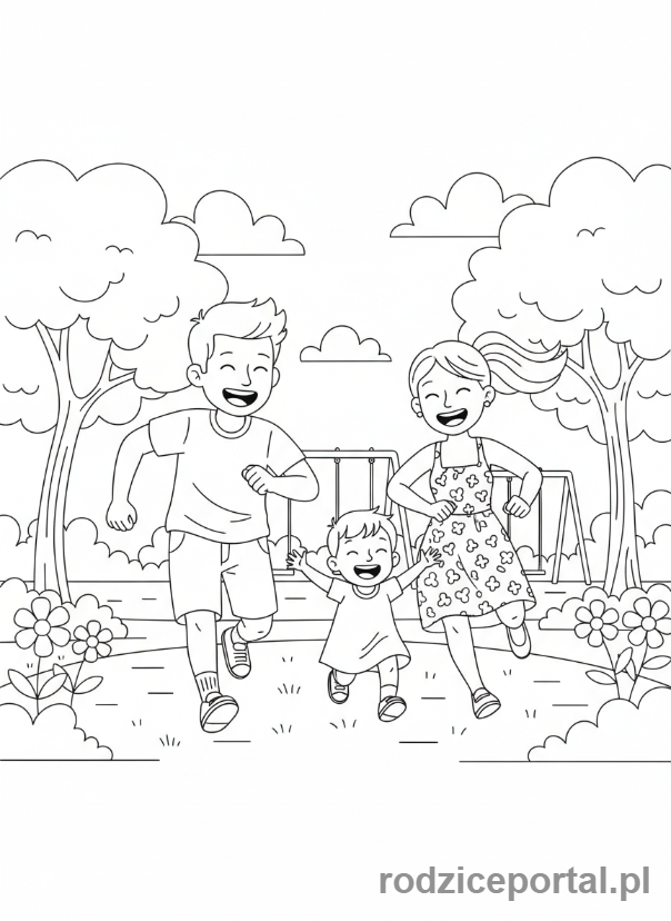 Kolorowanka Relacje Rodzinne – Rodzice z dzieckiem bawiący się w parku