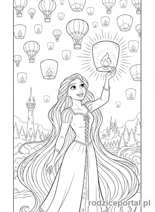 ⬇️ PobierzKolorowanka Roszpunka – Roszpunka z latarnią, oglądająca latające lampiony