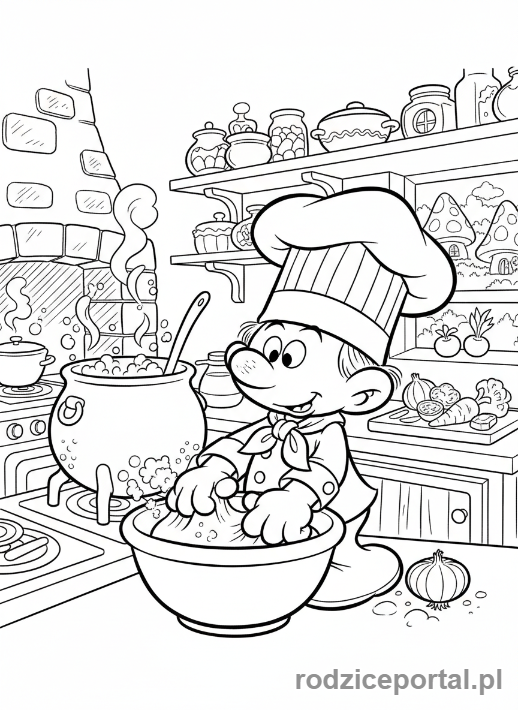 Pobierz darmowe kolorowanki Kolorowanka Smerfy Smerf Kucharz Przygotowujący Ciasto. Idealne dla dzieci do druku.