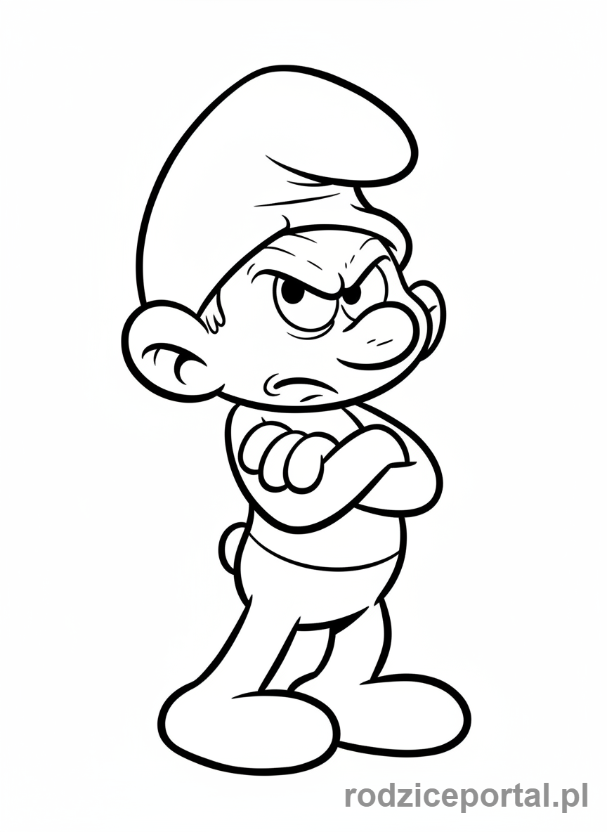 Kolorowanka Smerfy – Smerf Maruda z założonymi rękami, niezadowolony