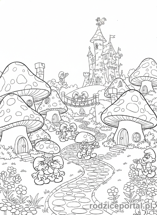 Pobierz darmowe kolorowanki Kolorowanka Smerfy Wioska Smerfów Z Mieszkańcami. Idealne dla dzieci do druku.