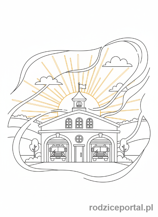 Kolorowanka Strażak Sam - Remiza strażacka o zachodzie słońca, malowniczy widok.