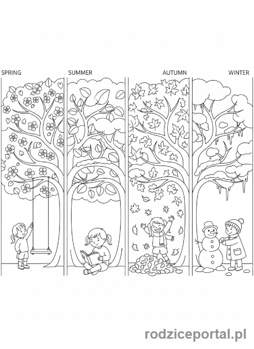 Pobierz darmowe kolorowanki Kolorowanka Zabawy Edukacyjne Cztery Pory Roku. Idealne dla dzieci do druku.