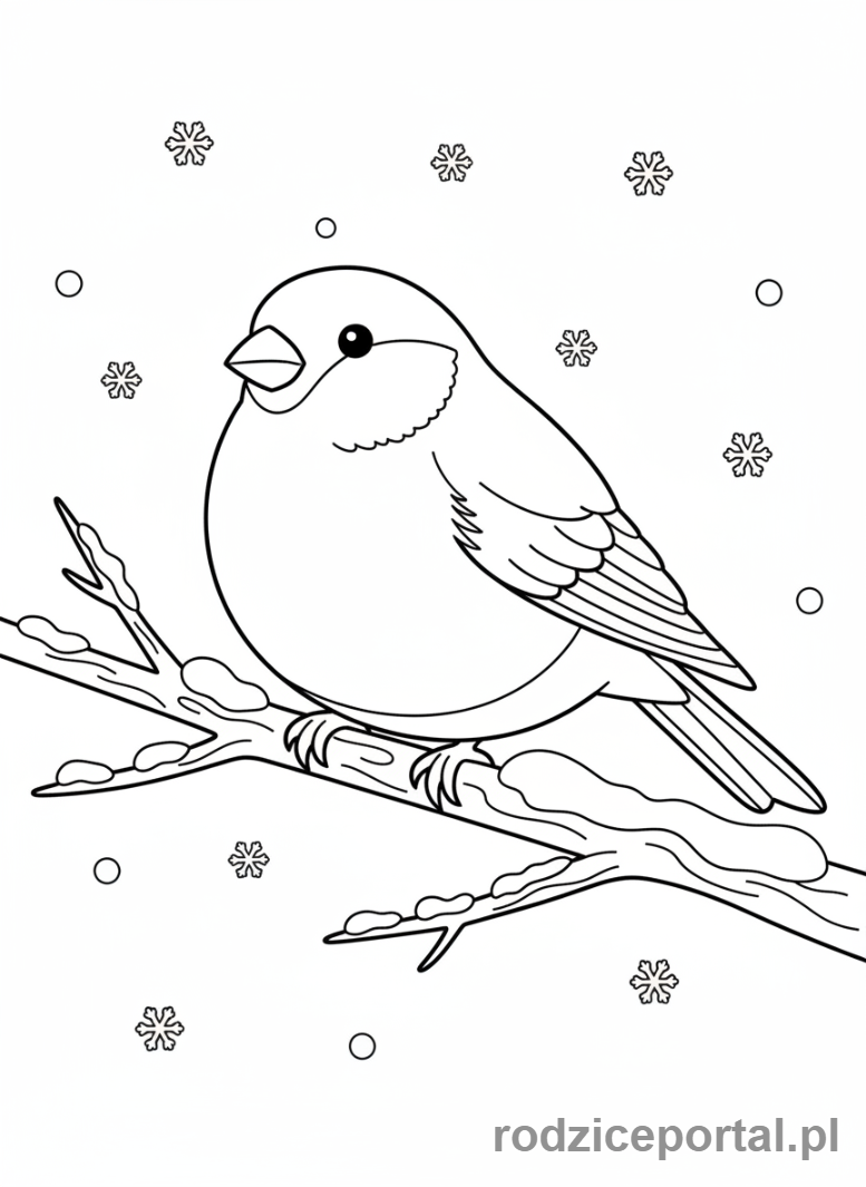 Kolorowanka Zimowe – Zimowy ptak (gil) na gałęzi.