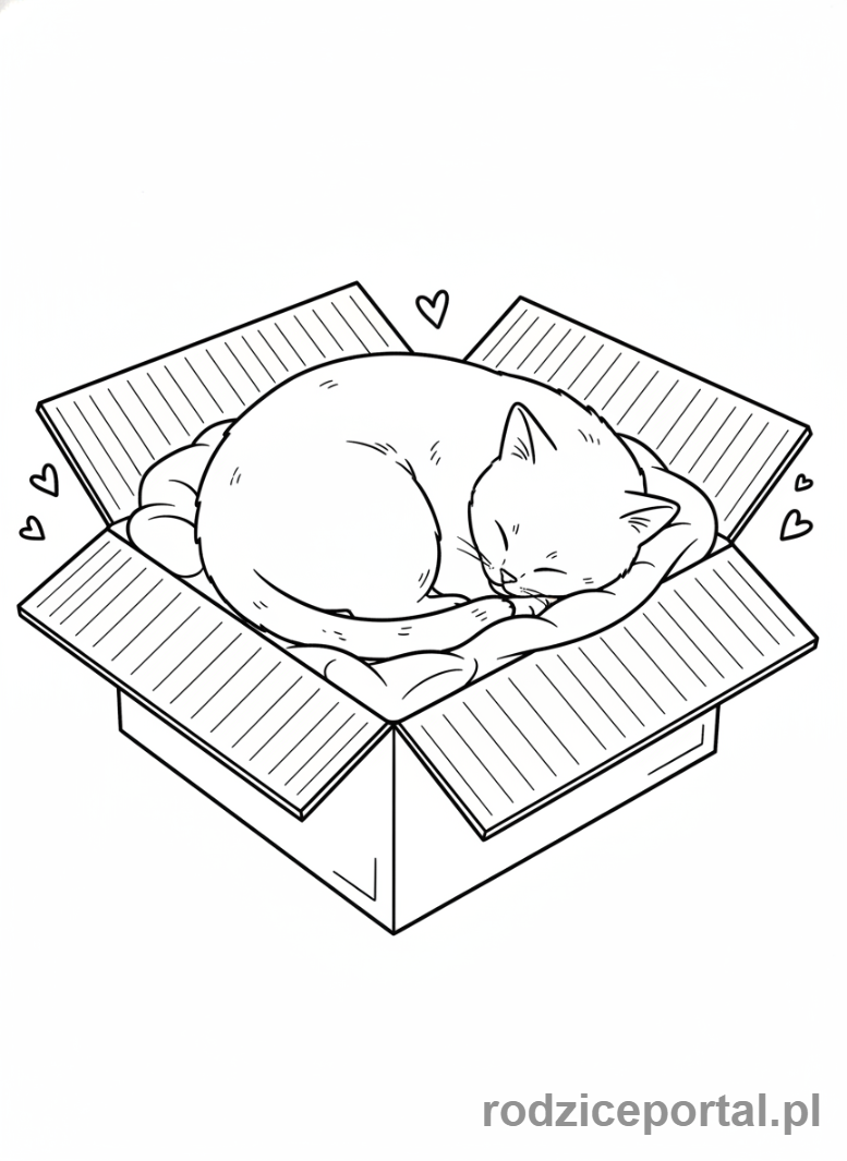 Kolorowanka Zwierzęta Domowe – Kot śpiący w pudełku.